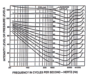 The equal loudness contours provide an insight to how we perceive sounds at various frequencies and levels of intensity. This is an important element to keep in mind as we move forward and begin to learn more about sound and acoustical products. Make notes, describe as accurately as you can what the walls are constructed of, what the floor covering is and what type of ceiling is present. If the ceiling is an acoustical ceiling, the acoustic tiles will be either, 12"x12", 24"x24" or 24"x48". The latter two will most likely be installed in a Tee Bar suspension system. Note also the number of light fixtures and HVAC diffusers or speaker panels. Lighting fixtures with their acrylic face covers do not have the same acoustical value as acoustical tiles and often account for 10% or more of the ceiling surface. If the school is an older building be sure to see if you can tell if the ceiling tiles have been painted over the years, This is usually quite obvious and will give a clue to the fact that the acoustical absorbing qualities have been greatly diminished. Be sure to consult with the custodian or the buildings and grounds person as they may be able to help determine the type of ceiling tile used, whether the walls are painted concrete block, drywall, plaster or some other material. Most flooring products are either glue down direct carpeting or a hard surfaced floor tile. Glue down carpeting is generally not much more than an1/8th to 3/16th of an inch thick. Carpet under padding is rarely used in school facilities. Note the grade level of the classroom, if possible, when the school was built and the number of students in the class. Now you are ready to look and listen. Listen to any noises you can hear and focus on the source of the noise(s). Noise sources may be coming from the window area, the HVAC system, and the lighting ballasts or through the walls or doors. When you are concentrating on the sources and nature of noise it can be quite directional. Note your observations on your sketch. The room you are evaluating should be as airtight as possible so if you can see cracks or holes in walls or the windows sound is going to leak into the room. The room is only as good as the weakest link. Many schools use folding doors between classrooms or demountable partitions that extend only up to the ceiling. If you can see light above the partition, there is a problem. Look to see if the partitions extend all the way up to the deck above the ceiling. You can do this by lifting out a ceiling tile and looking around above the ceiling. (Have the custodian help you) If you can see light from adjacent classrooms, there is a problem. The best construction techniques that will afford the best noise isolation are walls that extend from the floor to the underside of the deck above the ceiling. Anything less is likely to result in sound transmission problems and increase background noise levels. A list of background noise sources: Through walls from adjacent classrooms.