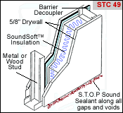 Decoupler can be mounted to an existing surface. Always use 2 layers of drywall whenever possible. One layer of 1/2" and one layer of 5/8" and leave a 1/8" gap around the perimeter of the wall of the drywall and fill with our acoustical sealant. This will decouple the constructed wall surface from the other room structures. |